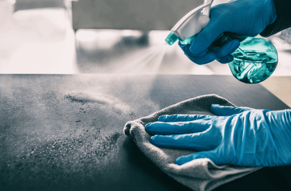 A person wearing blue gloves cleaning a desk with a spray bottle and cloth, surrounded by a calculator, coffee cup, and laptop, emphasizing the importance of maintaining a clean workspace.